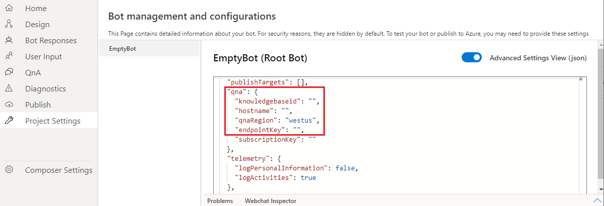 To securely edit the QnA Maker settings, use the Advanced Settings View (json) view.