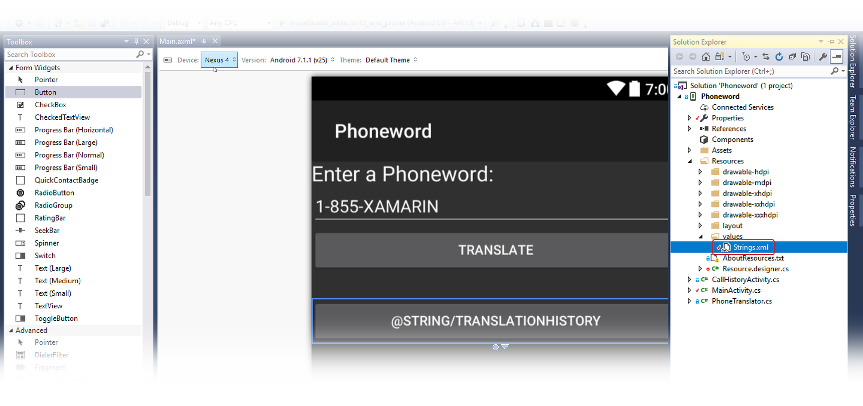 Start by opening the Phoneword application in Visual Studio and editing the Main.axml file from the Solution Explorer.
