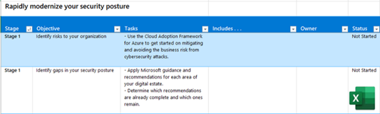 This Excel workbook to assign owners and track your progress for these stages, objectives, and their tasks. Here's the worksheet for this business scenario.