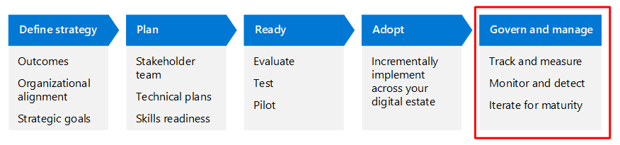| Define strategy | Plan | Ready | Adopt | Govern and manage |