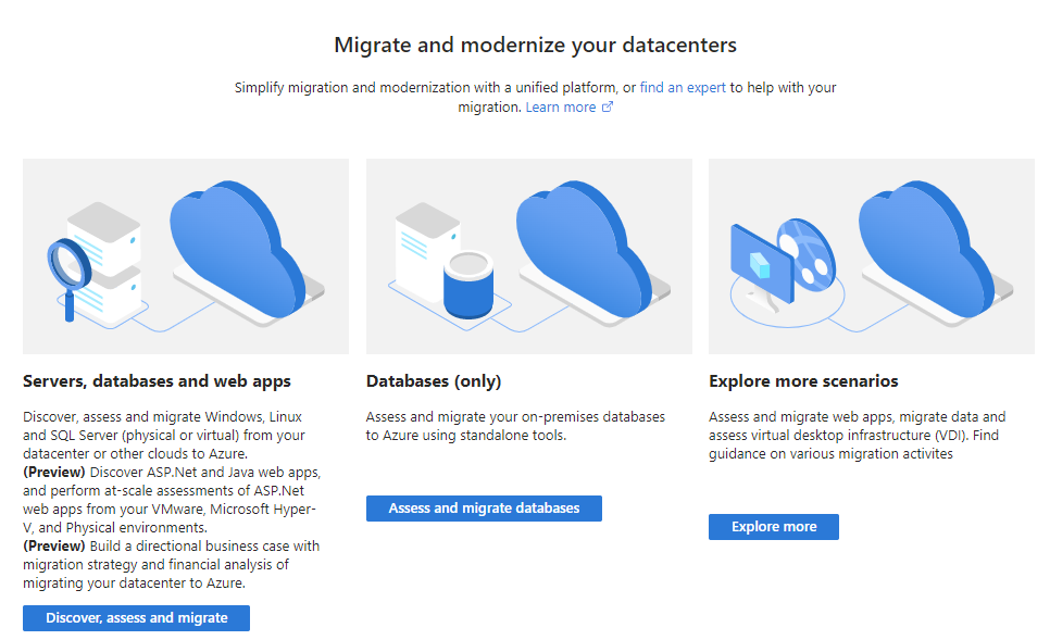 This assessment type helps you to develop a comprehensive business case to assess the return on investment for migrating servers, SQL Server deployments, and ASP.NET web apps to Azure. You can also eliminate uncertainty and gain insights on Total Cost of Ownership (TCO), resource utilization, and quick wins for migration and modernization.