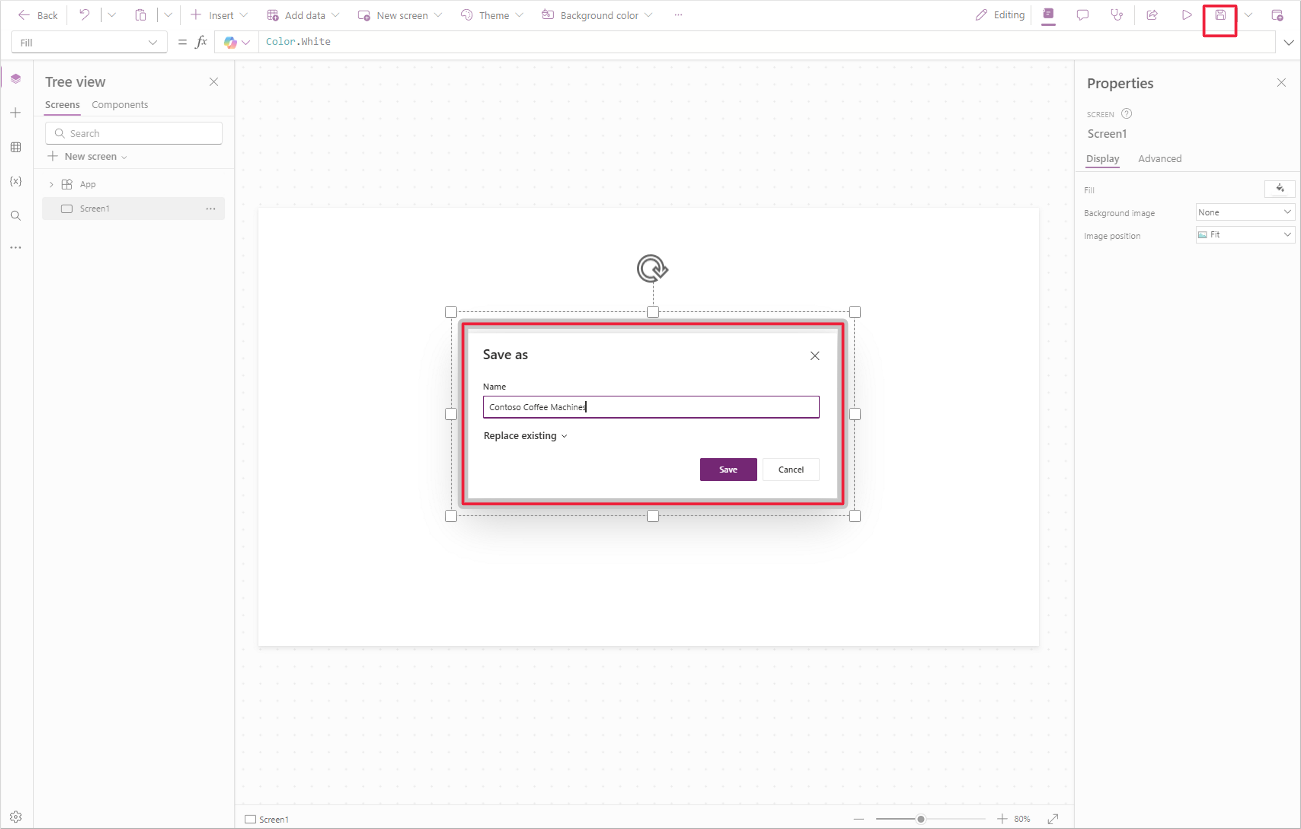 Select Save from the top right of the screen, and in the Save as window name your app Contoso Coffee Machines. Select Save.