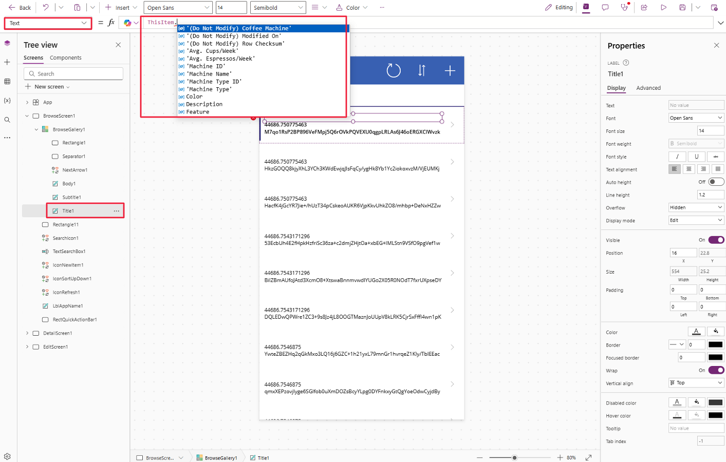 ThisItem.(be sure to enter the period). The autocomplete feature displays a list of all the available fields for the current item in the gallery.Since you want the machine's name to appear in the title, select 'Machine Name' from the drop-down list. Notice that the formula bar now shows