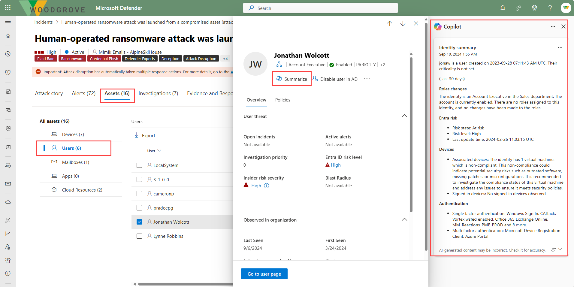 Similarly, Copilot in Microsoft Defender XDR can summarize identities.