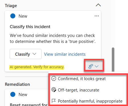 As with the standalone experience, the embedded experience provides users a mechanism to provide feedback on the accuracy of the AI generated response. For any AI generated content, you can select the feedback prompt on the bottom right of the content window and select from the available options.