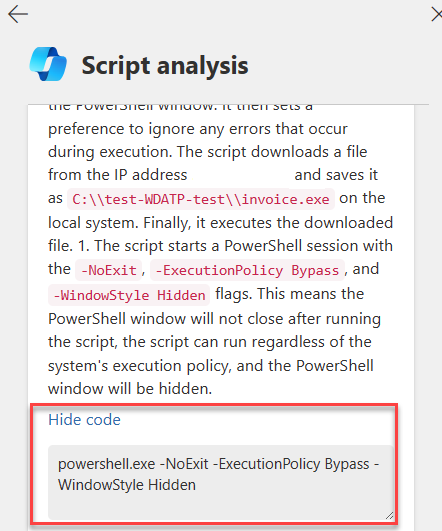 Copilot analyzes the script and displays the results in the script analysis card. Users can select the Show code to see specific lines of code related to the analysis. To hide the code, users need only to select Hide code.