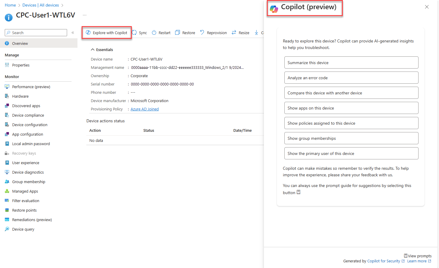 You can use Copilot to get device-specific information, like the installed apps, group membership, and other information that can help troubleshoot a device.