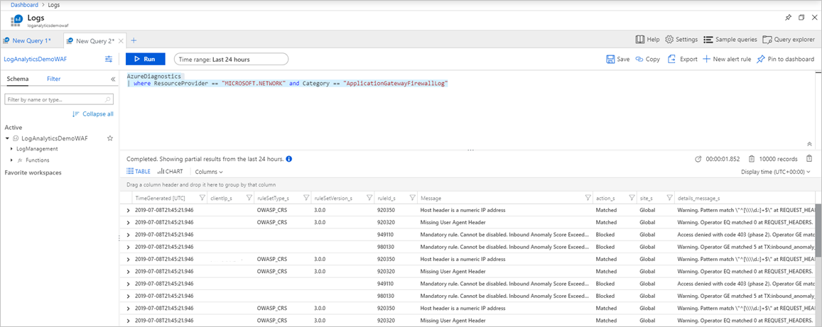 | where ResourceProvider == "MICROSOFT.NETWORK" and Category == "ApplicationGatewayFirewallLog"