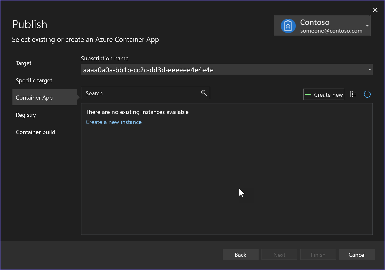 2. In Solution Explorer, right-click on the project node for the Webfrontend project, and select Publish. On the next screen, select Create new to create a new container app.