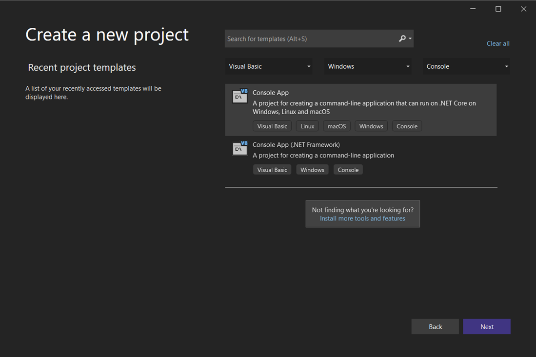 If you do not see the Console App template, you can install it from the Create a new project window. In the Not finding what you're looking for? message, choose the Install more tools and features link.