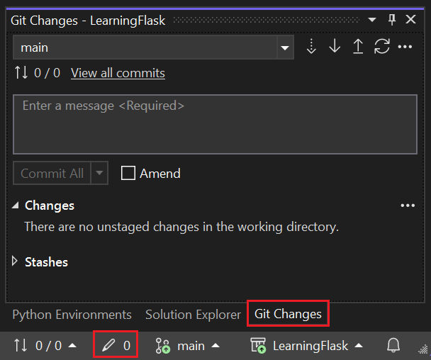 This window shows details about any uncommitted changes, including stashed changes. Because your newly created project is already committed to source control automatically, you don't see any pending changes.