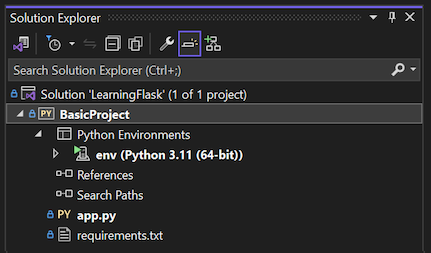 Open Solution Explorer to view your solution and Flask project files. The initial project contains only two files, app.py and requirements.txt: