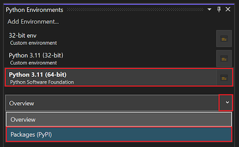 1. In the Python Environments window, select the default environment for new Python projects, then select Packages (PyPI) in the dropdown menu. (PyPI is the acronym for the Python Package Index.)