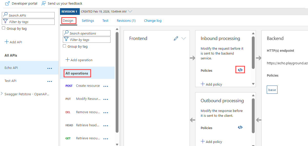 base. En la mayoría de los casos, esto no se recomienda. Sin embargo, puede ser útil en determinadas situaciones, como cuando desea aplicar directivas diferentes a una operación específica de la configurada para el ámbito de la API (todas las operaciones).