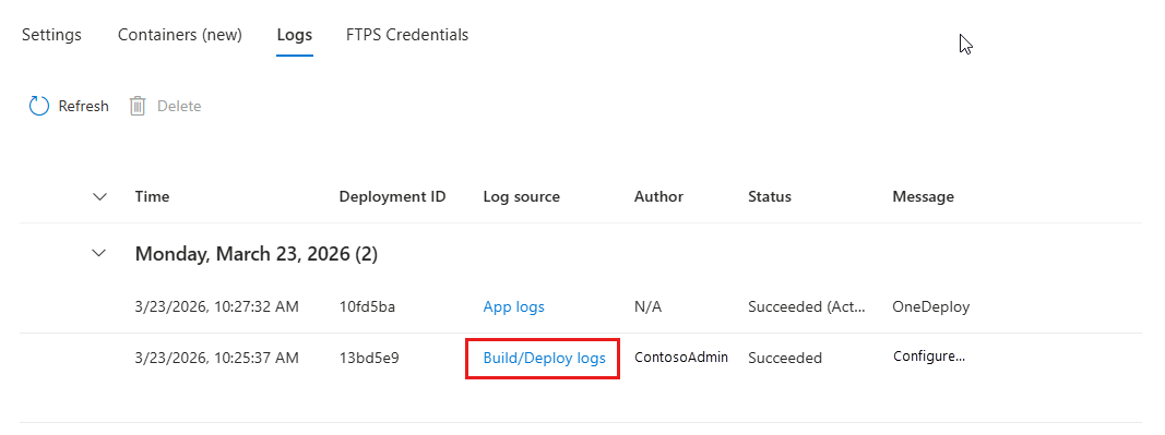 Stream App Service logs at: <URL>