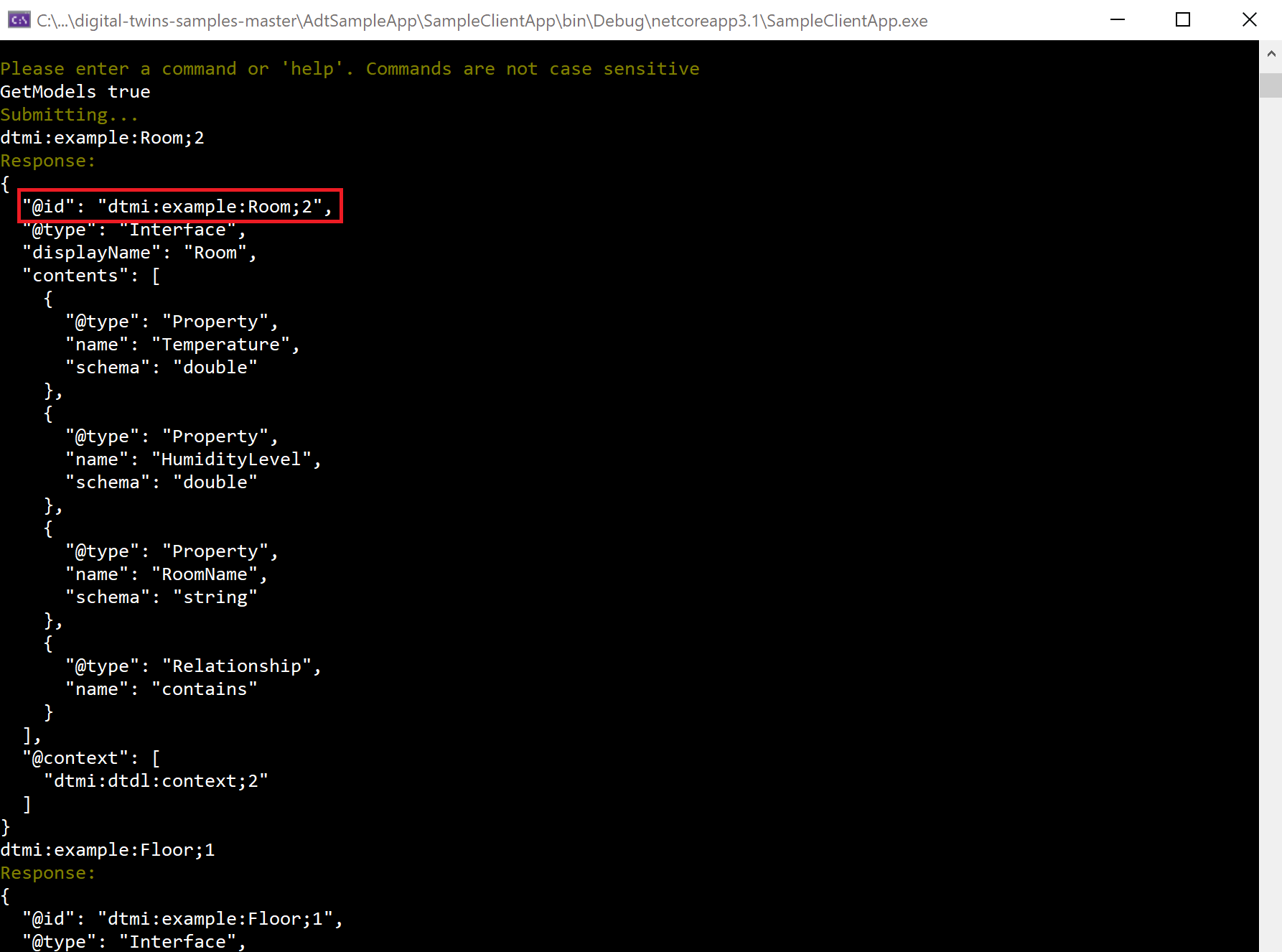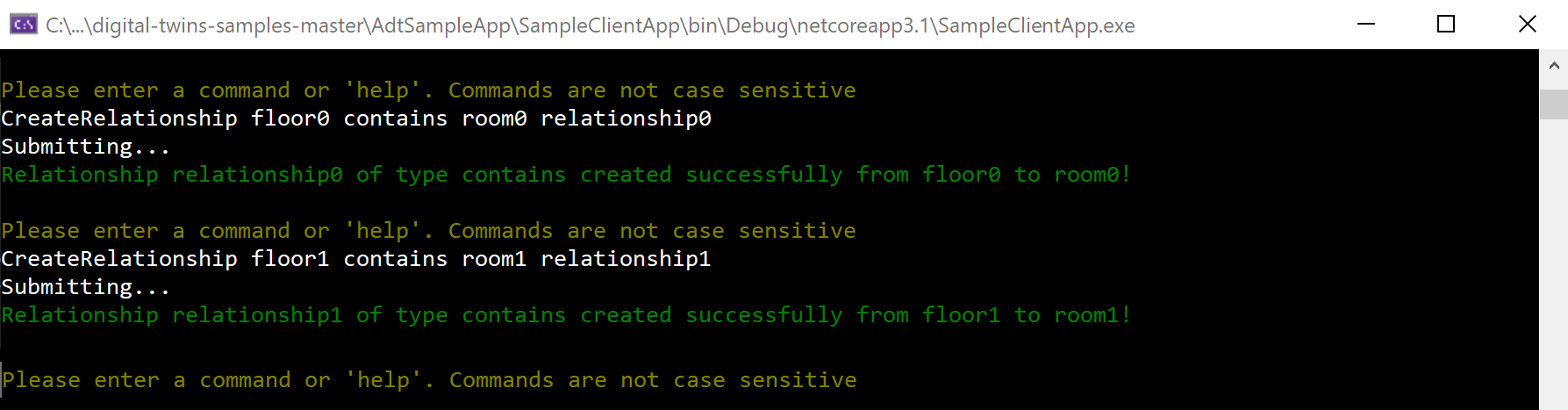 Vuelva a la ventana de la consola que está abierta en la carpeta digital-twins-samples-main\AdtSampleApp\SampleClientApp y vuelva a ejecutar la aplicación de consola mediante el comando