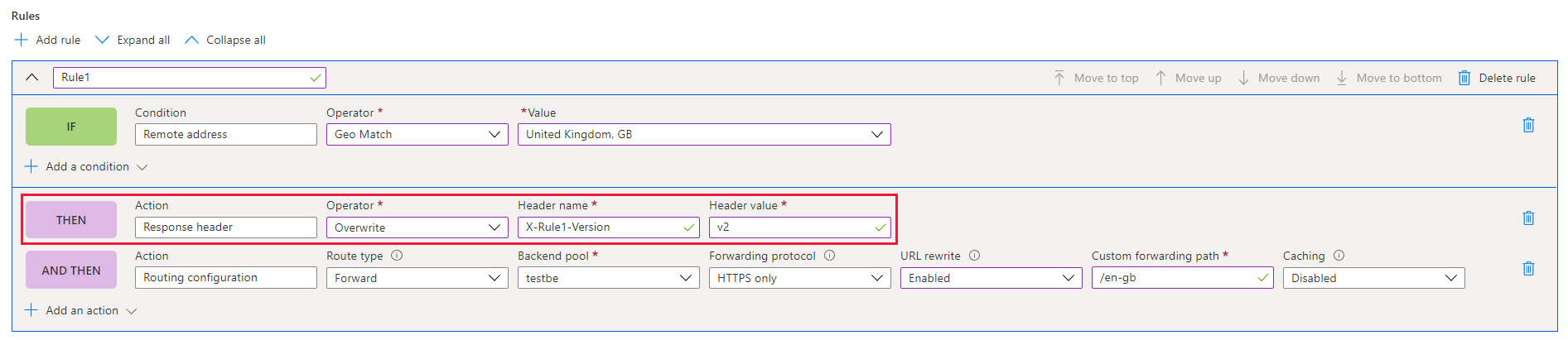 Si desea comprobar cuándo se propagan los cambios a Azure Front Door (clásico), puede crear un encabezado de respuesta personalizado en la regla mediante el ejemplo siguiente. Puede agregar un encabezado de respuesta