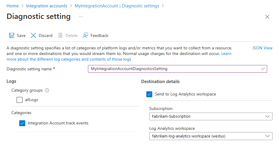 Puede habilitar el registro de Azure Monitor directamente desde la cuenta de integración.