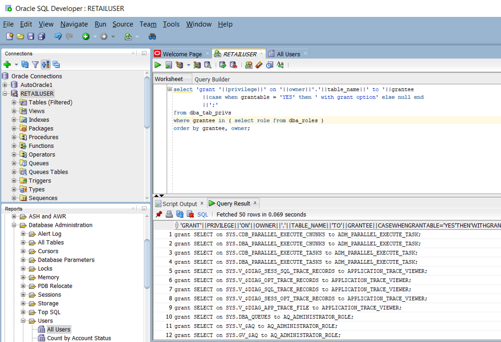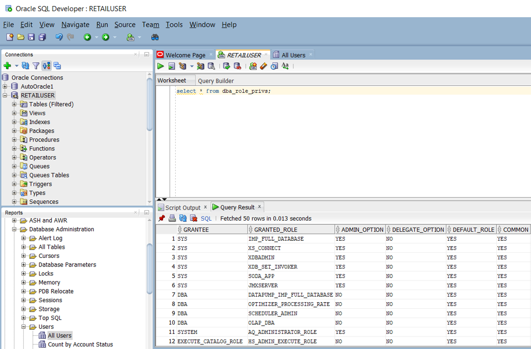 Oracle SQL Developer tiene opciones integradas para mostrar información de usuario y rol en el panel Informes, como se muestra en la captura de pantalla siguiente.