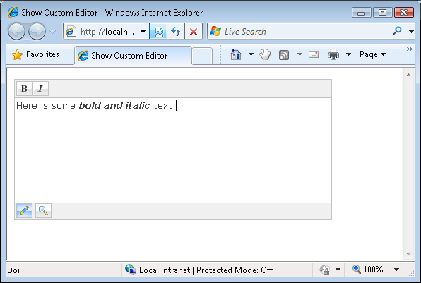 Puede personalizar los botones de la barra de herramientas derivando un nuevo Editor HTML de la clase Base Editor. Por ejemplo, el editor personalizado de la lista 2 solo contiene botones de barra de herramientas para negrita y cursiva. Se han quitado todos los demás botones de la barra de herramientas. Además, la pestaña HTML se ha quitado de la parte inferior del editor (pero las pestañas Diseño y vista previa siguen estando ahí).
