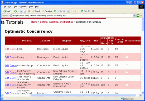 DBConcurrencyException solo se produce cuando se utiliza el patrón de actualización por lotes del DAL. El patrón directo de base de datos no genera una excepción, simplemente indica que no se ha visto afectada ninguna fila. Para ilustrar esto, devuelva gridView de ambas instancias del explorador a su estado de edición previa. A continuación, en la primera instancia del explorador, haga clic en el botón Editar y cambie el nombre del producto de "Chai Tea" de nuevo a "Chai" y haga clic en Actualizar. En la segunda ventana del navegador, haga clic en el botón Eliminar de Chai.