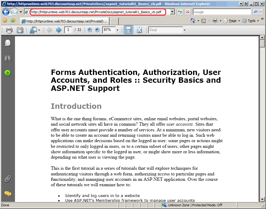 Con el ASP.NET Servidor de desarrollo, visite el sitio y escriba la dirección URL directa a uno de los archivos PDF en la barra de direcciones del explorador. Si descargó el sitio web asociado a este tutorial, la dirección URL debería tener un aspecto similar al siguiente: http://localhost:portNumber/PrivateDocs/aspnet_tutorial01_Basics_vb.pdf