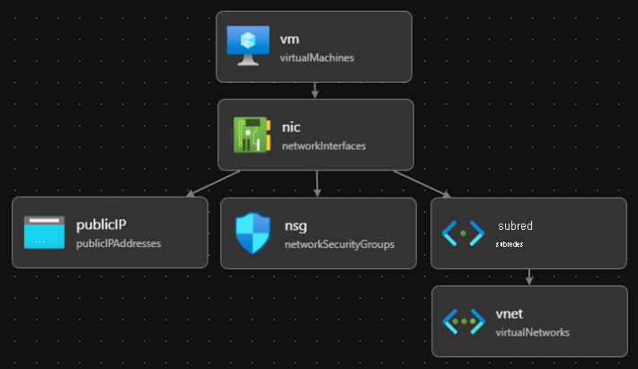 El visualizador de Bicep muestra los recursos definidos en el archivo de Bicep y las dependencias entre ellos. El diagrama siguiente es una representación visual de un archivo de Bicep para una máquina virtual Linux.