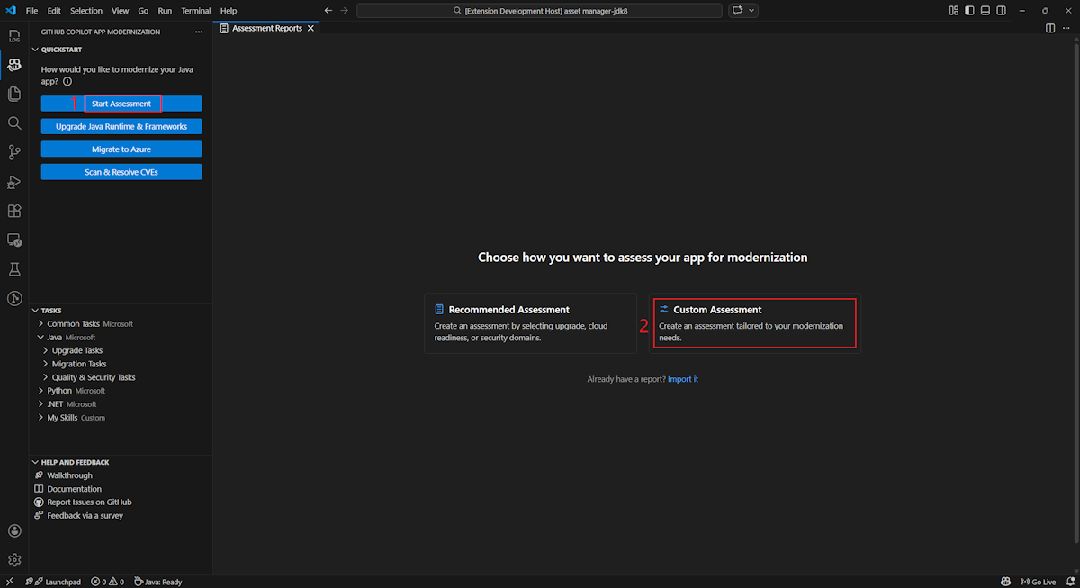 - Seleccione Start Assessment (Iniciar evaluación ) o Open Assessment Dashboard (Abrir panel de evaluación) en la sección QUICKSTART del panel de modernización de GitHub Copilot.