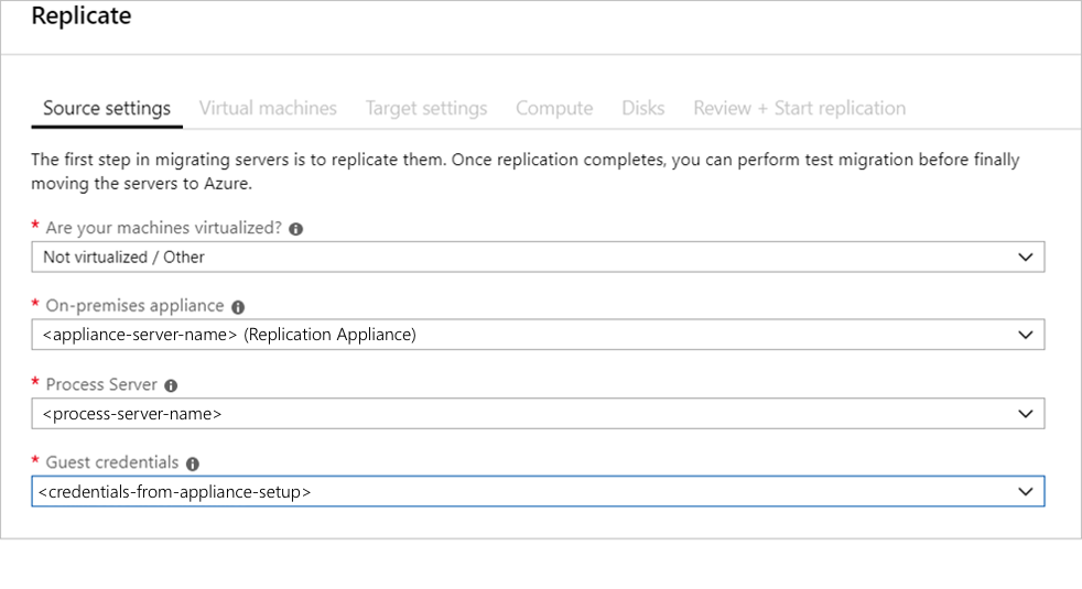 En Replicar, >Configuración de origen>¿Están las máquinas virtualizadas?, seleccione Físicos u otros (AWS, GCP, Xen, etc.).