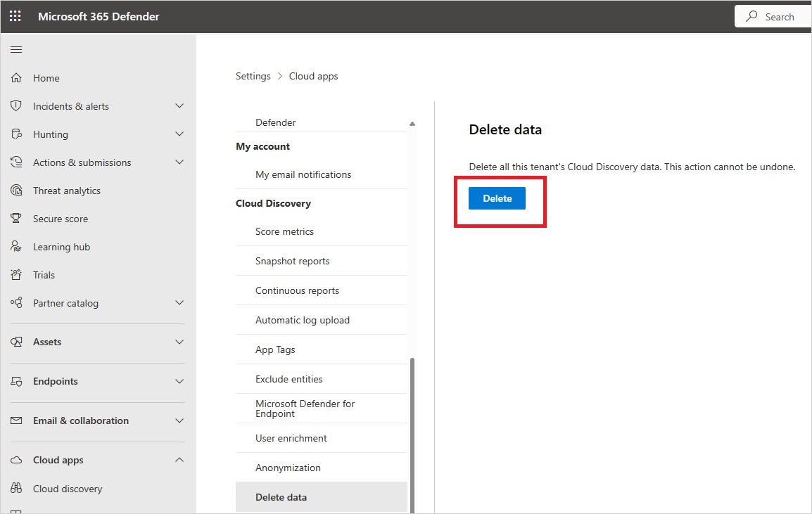 1. En Microsoft Defender Portal, seleccione Configuración Cloud>Apps>Cloud Discovery>Eliminar datos.