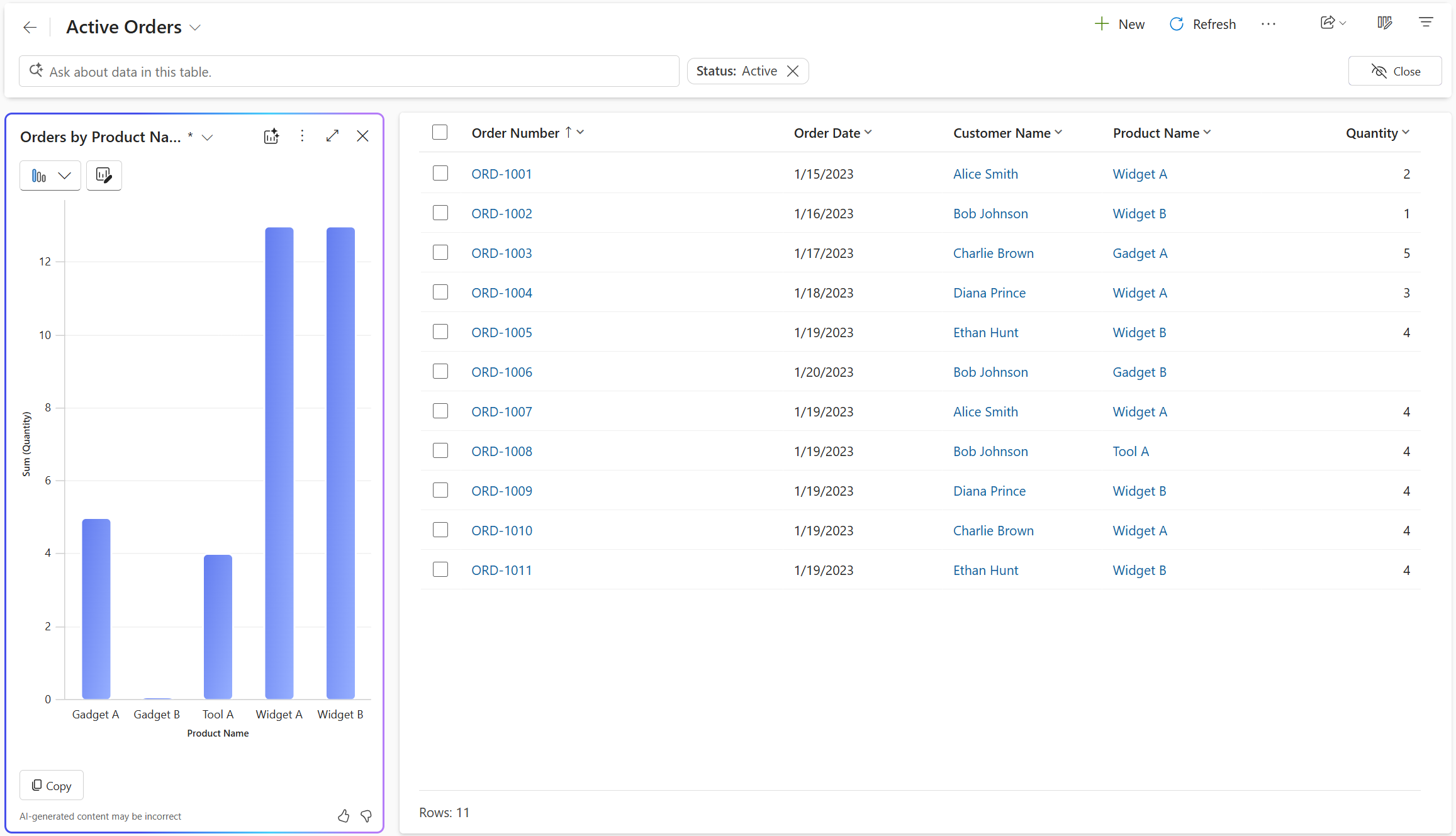 Cuando selecciona Visualizar, el panel del gráfico se abre junto a la cuadrícula, complementando la tabla de filas. Si la tabla tiene gráficos personales o del sistema, aparece el gráfico predeterminado de la tabla. Si la tabla no tiene gráficos, AI genera una visualización para la visión en función de las columnas y filtros visibles. La visualización es un gráfico que agrega los datos en la vista.