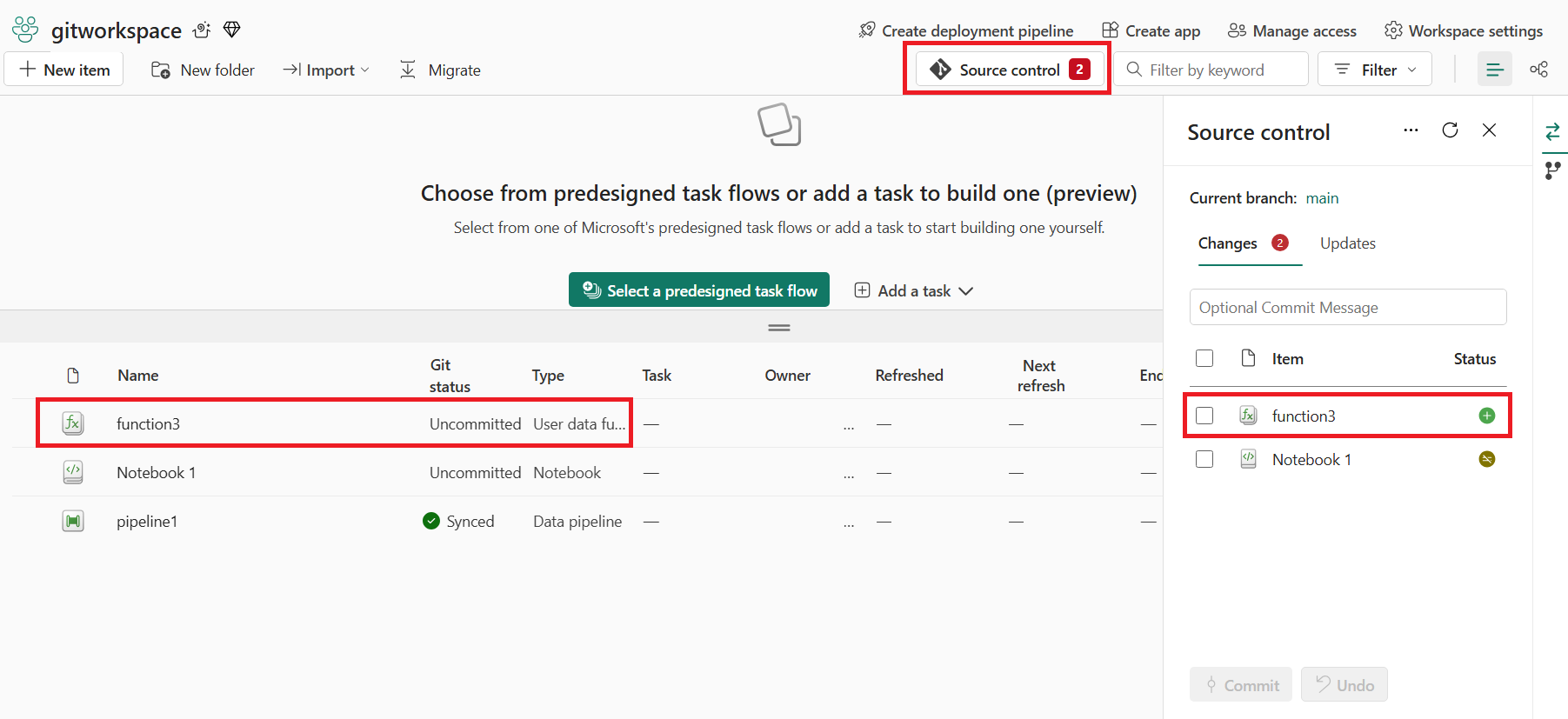 Desde la configuración del área de trabajo, puede configurar fácilmente una conexión al repositorio para confirmar y sincronizar los cambios. Para configurar la conexión, consulte Introducción a la integración de Git. Una vez conectados, los elementos, incluyendo las funciones de datos de usuario, aparecerán en el panel Control de código fuente.