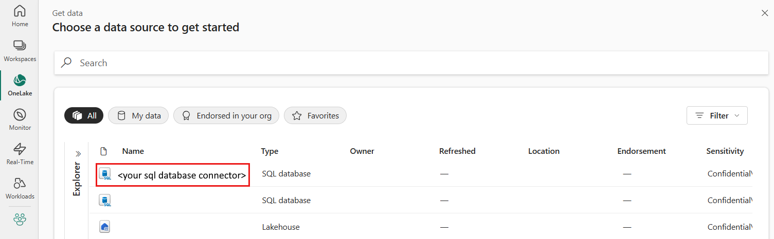 Para crear una conexión de base de datos SQL en una canalización, seleccione una base de datos SQL existente en la sección OneLake .