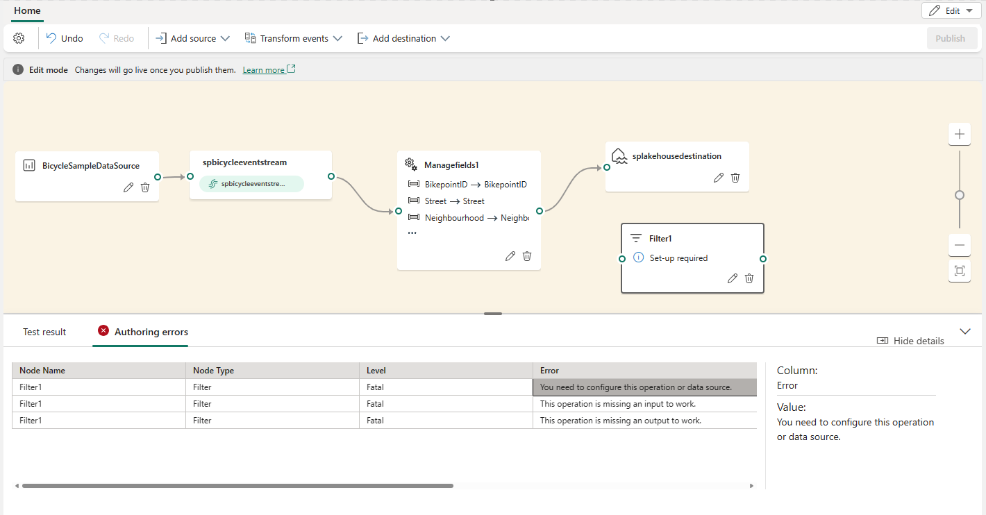 Puede usar el editor de procesamiento de eventos (el área de trabajo en modo de edición) para transformar los datos hacia varios destinos. Ingrese en modo de edición para diseñar operaciones de procesamiento de datos.