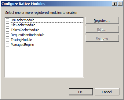 En el cuadro de diálogo Configurar módulos nativos, seleccione la opción del módulo nativo que acaba de registrar, haga clic en Aceptar y, a continuación, vuelva a hacer clic en Aceptar. Esta acción permite que el módulo nativo se ejecute y que esté disponible para sitios y aplicaciones en el servidor web.