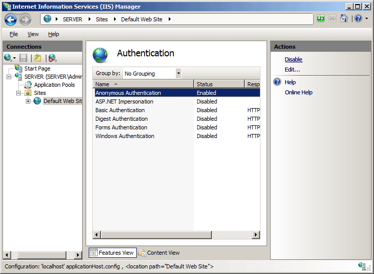 En el panel Autenticación, seleccione Autenticación anónima y, a continuación, haga clic en Deshabilitar en el panel Acciones.