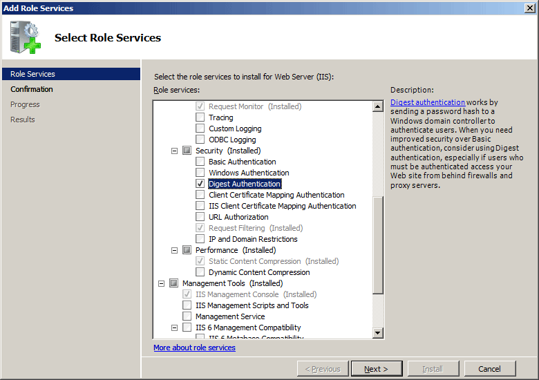 El elemento <digestAuthentication> se puede configurar en el nivel de sitio, aplicación, directorio virtual y URL. Después de instalar el servicio de rol, IIS 7 confirma las siguientes opciones de configuración en el archivo ApplicationHost.config.