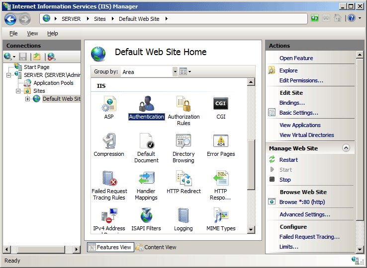 En el panel Conexiones, expanda el nombre del servidor, expanda Sitios y haga clic en el sitio, aplicación o servicio web para el que desea habilitar la autenticación de Windows.