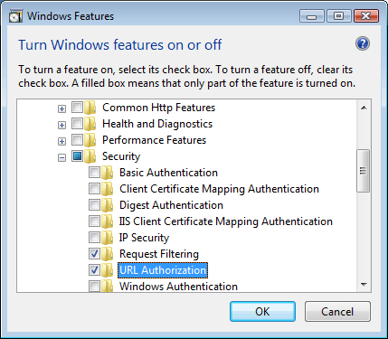 1. En la barra de tareas, haga clic en Inicio y, luego, haga clic en Panel de control. - En Panel de control, haga clic en Programas y características y después en Activar o desactivar las características de Windows. - Expanda Internet Information Services, seleccione Autorización de dirección URL y, a continuación, haga clic en Aceptar.