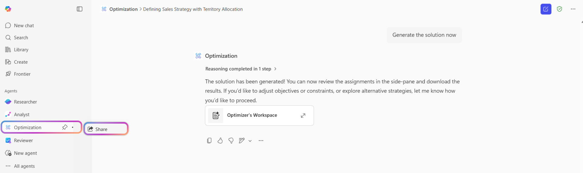 Mediante el uso de un agente de contexto optimizado, puede guardar un problema de optimización personalizado para reutilizarlo en toda la organización. El agente recuerda la estructura del problema, incluidos los objetivos, las restricciones, los objetivos y el esquema de datos.
