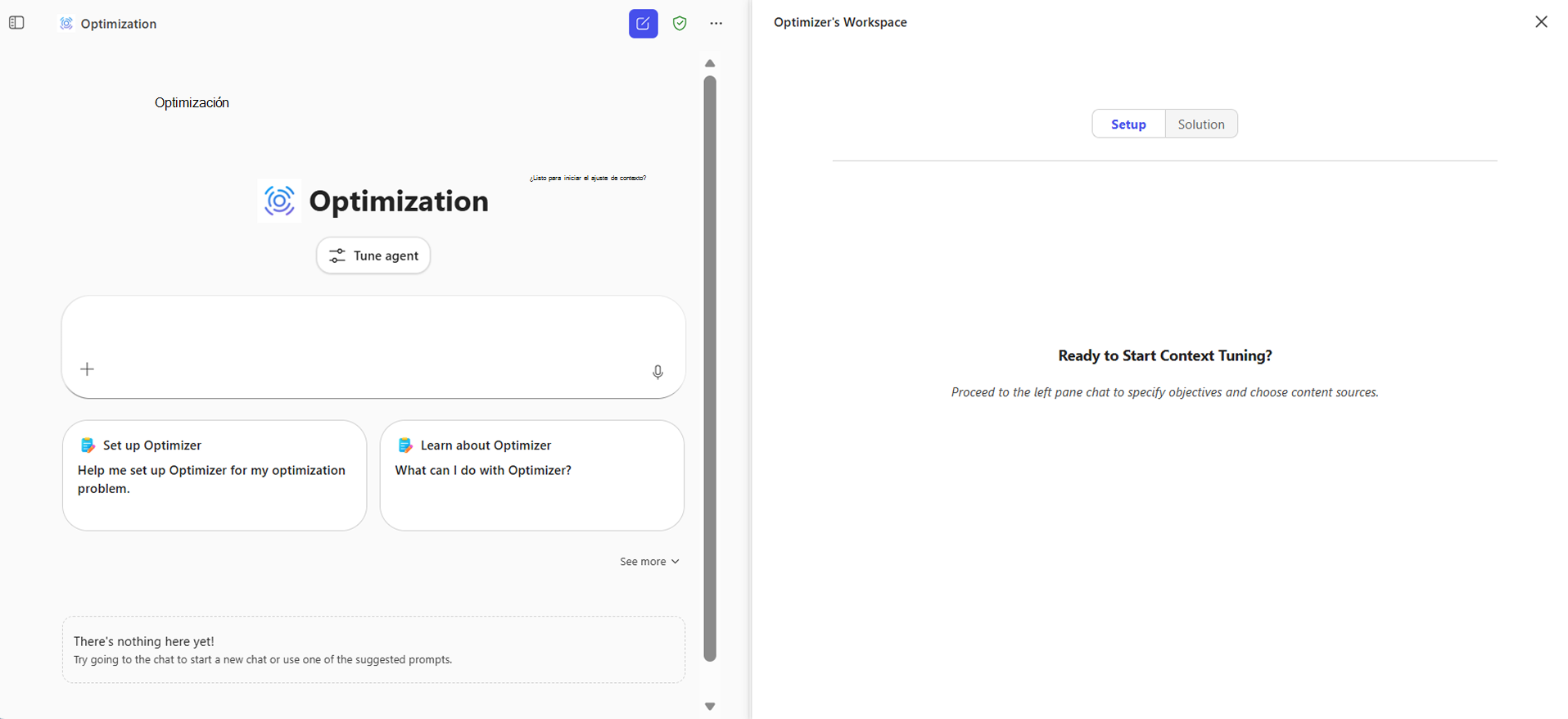 5. Use el chat para describir el objetivo, cargar datos, definir restricciones y especificar objetivos. Revise la configuración en el panel lateral a medida que vaya.