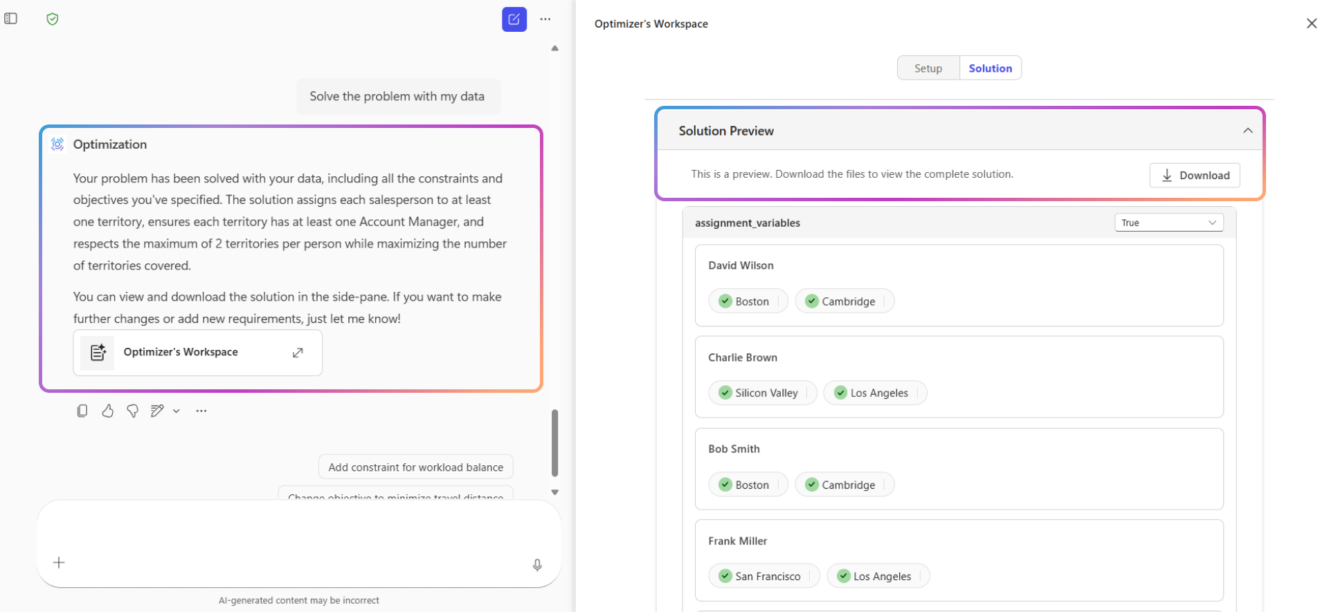 Después de proporcionar esta información, el agente usa herramientas de solucionador para calcular una solución óptima que satisfaga todas las restricciones y objetivos. Presenta los resultados en una experiencia interactiva y puede descargarlos como un archivo .csv.