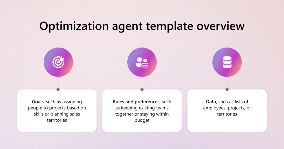 La plantilla Agente de optimización para Microsoft 365 Copilot le ayuda a modelar y resolver problemas de optimización empresarial específicos de su organización. Use el agente para tomar decisiones óptimas en escenarios como la organización de equipos, la asignación de trabajo o la planificación de estrategias de ventas.
