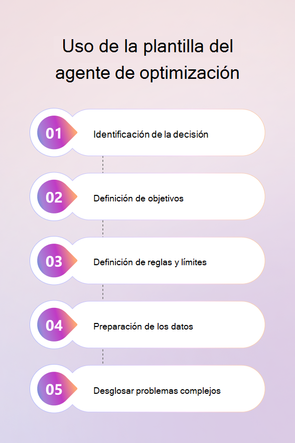 Use la plantilla Agente de optimización cuando necesite determinar la mejor decisión posible en virtud de restricciones. Empiece por identificar la decisión que desea optimizar.