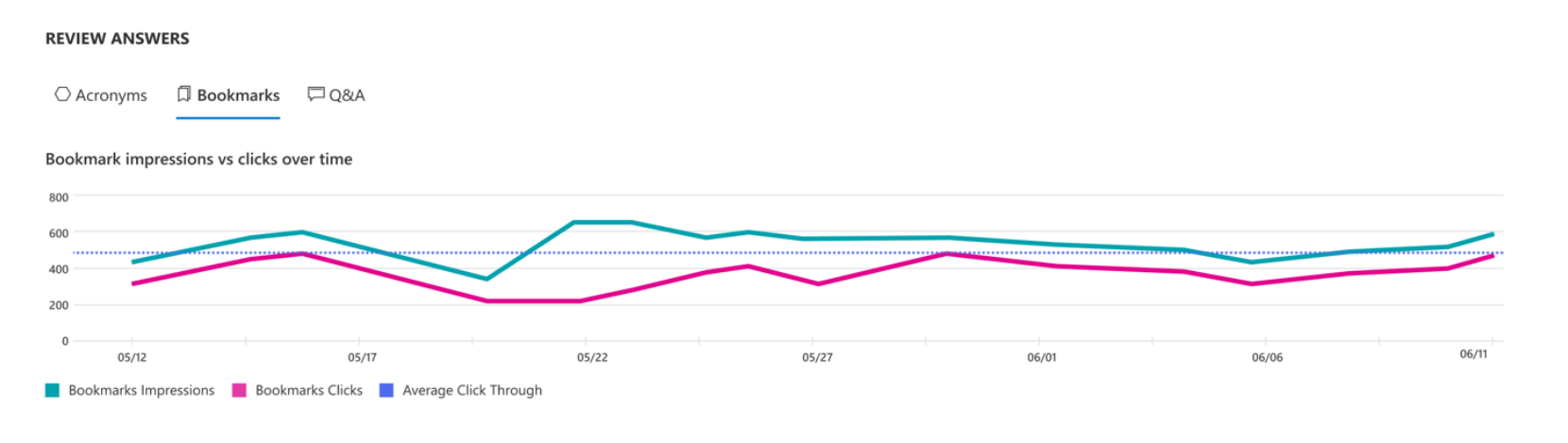 En el Informe de uso de búsqueda de Microsoft, la sección Análisis de respuestas proporciona información sobre cómo funcionan los marcadores editoriales, acrónimos y Q&A dentro de la organización.