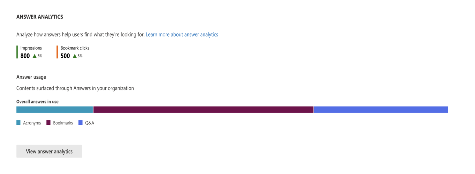 Answer Analytics no se admite actualmente para el intervalo de filtros de 12 meses y para determinados tipos de inquilinos. En caso de que no vea la característica Answer Analytics en el inquilino de prueba, envíenos un correo electrónico a searchadminxteam@service.microsoft.com y nos pondremos en contacto con usted para realizar una investigación más detallada.