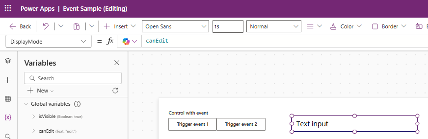 isVisibleycanEditcuando se hace clic en los botones.Evento Expresión Power FX customEvent1 If(isVisible, Set (isVisible, false), Set (isVisible, true))customEvent2 If(canEdit = DisplayMode.Edit, Set(canEdit, DisplayMode.Disabled), Set (canEdit, DisplayMode.Edit))