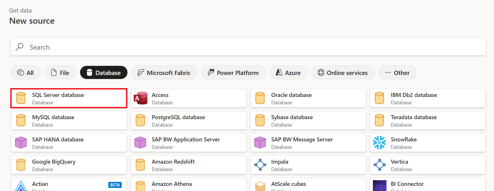 Captura de pantalla de la página Nuevo origen con la pestaña base de datos seleccionada y el conector de base de datos de SQL Server resaltado.