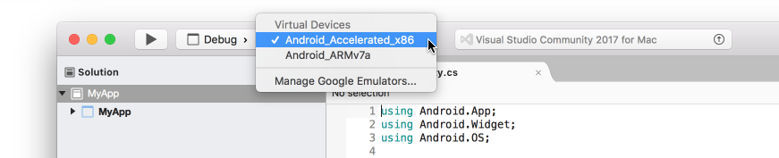 Android Emulator (incluido como parte de la carga de trabajo Desarrollo para dispositivos móviles con .NET) se puede ejecutar en varias configuraciones para simular otros dispositivos Android. Cada una de estas configuraciones se crea como un dispositivo virtual. En esta guía, obtendrá información sobre cómo iniciar el emulador desde Visual Studio y ejecutar la aplicación en un dispositivo virtual. Para obtener información sobre cómo configurar Android Emulator y crear dispositivos virtuales, vea Configuración de Android Emulator.