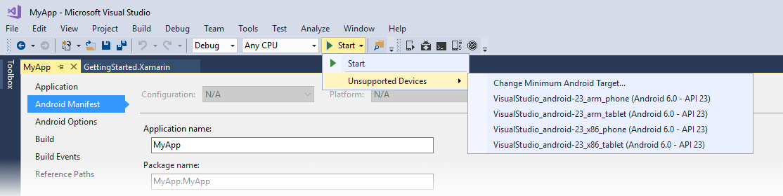 Puede hacer clic en Cambiar destino mínimo de Android para cambiar la versión mínima de Android del proyecto de modo que coincida con el nivel de API de los dispositivos virtuales disponibles. También puede usar Android Device Manager para crear dispositivos virtuales compatibles con el nivel de API de destino. Para poder configurar dispositivos virtuales para un nuevo nivel de API, debe instalar las imágenes del sistema correspondientes para ese nivel de API (vea Configuración de Android SDK para Xamarin.Android).
